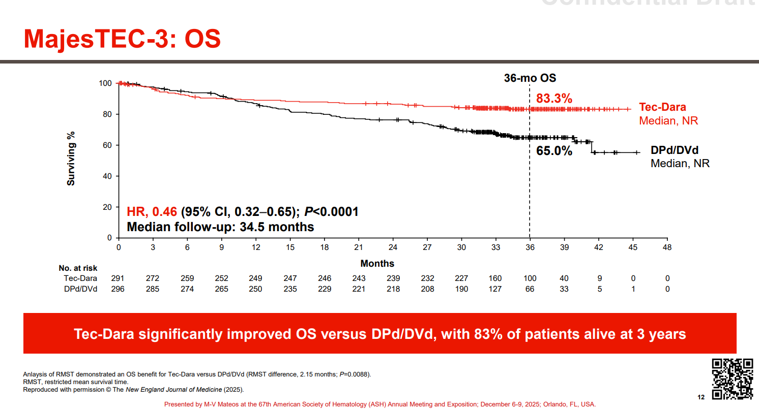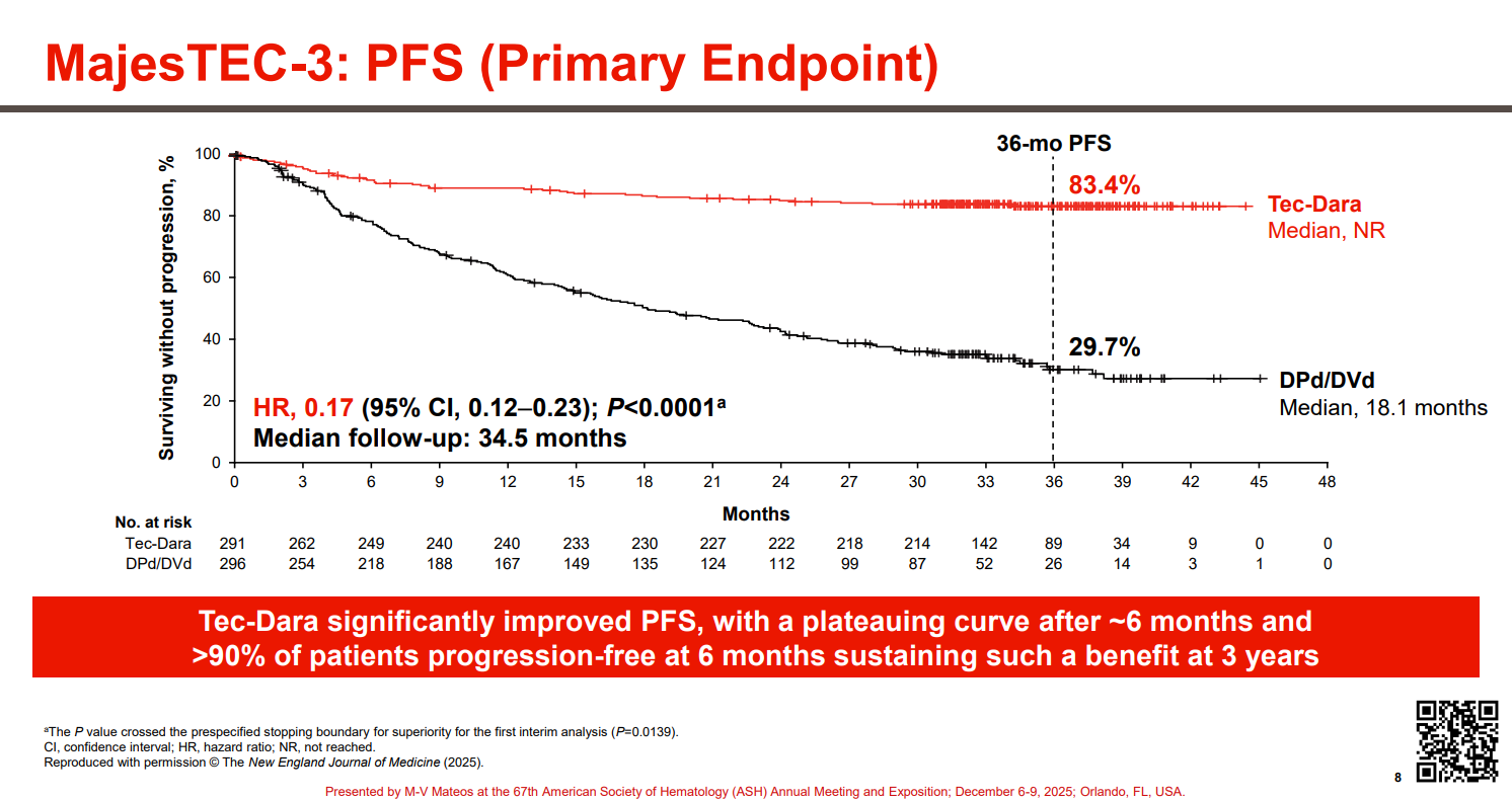 As already revealed in the ASH abstract, Tecvayli (a BCMA-targeting T-cell engager) plus Darzalex (an anti-CD38 MAb) reduced the risk of progression or death by 83% versus Darzalex plus dexamethasone and either Pomalyst or Velcade.