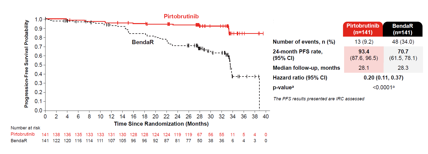 Interpretation of ‘314, meanwhile, is slightly more problematic. That study was designed to show non-inferiority versus Imbruvica on ORR, and this it did, with nominal superiority to boot, at 87% for Jaypirca versus 79% for Imbruvica across both first-line and relapsed populations.