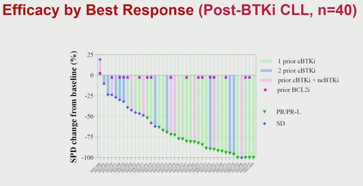 China’s Newave Pharmaceutical could soon become the first company to secure approval of a domestically discovered BTK inhibitor, having filed its lead project, rocbrutinib, with China’s NMPA in September. Data presented at ASH on Saturday suggest that this unusual molecule, said to inhibit BTK covalently under normal circumstances, but non-covalently if BTK carries the C481 mutation, might even have potential in patients who have failed covalent and non-covalent BTK inhibition alike. That’s a new development for rocbrutinib, which previously looked no better than non-covalents: at ASH two years ago no responses were reported among patients pretreated with a non-covalent BTK inhibitor like Lilly’s Jaypirca. The headline number from a phase 1 study now comprising 40 efficacy-evaluable CLL patients was a 63% response rate. This might seem unspectacular, but it was notable that best responses included four among eight patients pretreated with covalent and non-covalent BTK inhibitors, and two among four subjects who were triple-refractory (additionally having failed on a BCL-2 inhibitor). The presenter, Ohio State’s Dr Jennifer Woyach, suggested that this was especially relevant for such patients, who might have few treatment options. Coincidentally, Woyach is also lead investigator in the ASH presentation of Jaypirca’s Bruin CLL-314 study.