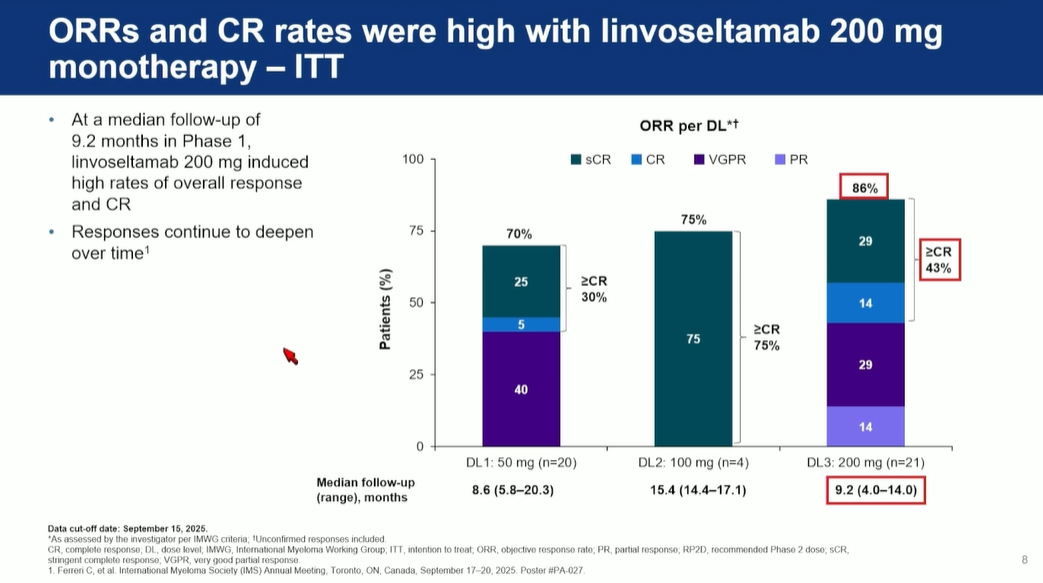 Linker-MM4 had a different, “window-of-opportunity” design, with patients given Lynozyfic monotherapy initially, then moved to standard of care if they didn’t show at least a partial response by cycle two, and a very good partial response by cycle four. Regeneron claimed it's the first clinical trial to evaluate a BCMA-targeting bispecific as monotherapy in newly diagnosed disease.