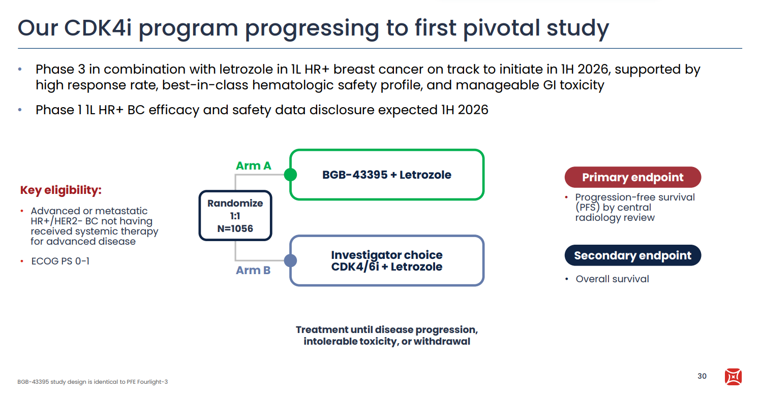 BeOne Medicines has a track record of carrying out head-to-head trials, and it will go down this route again with the phase 3 study of its CDK4 inhibitor BGB-43395. The company last year revealed plans to go pivotal in front-line breast cancer in 2026, but disclosed the first concrete details in its fourth-quarter earnings presentation on Thursday. The as-yet-unnamed trial in ER-positive, HER2-negative disease will test BGB-43395 plus letrozole, versus investigator’s choice of CDK4/6 inhibitor plus letrozole, with a primary endpoint of progression-free survival. CDK4/6 inhibitors like Novartis’s Kisqali and Pfizer’s Ibrance are widely used, but have been linked with neutropenia, which it’s hoped could be reduced by selectively targeting CDK4. The asset to catch here is Pfizer’s atirmociclib, which in January 2025 started the identically designed Fourlight-3 trial, which similarly goes head to head against a CDK4/6 inhibitor in the front line. Both projects have a high bar to clear: Kisqali plus letrozole produced a median PFS of 25 months in its first-line Monaleesa-2 trial. Meanwhile, BeOne last year dropped development of BGB-43395 in second-line breast cancer, citing an evolving competitive landscape.