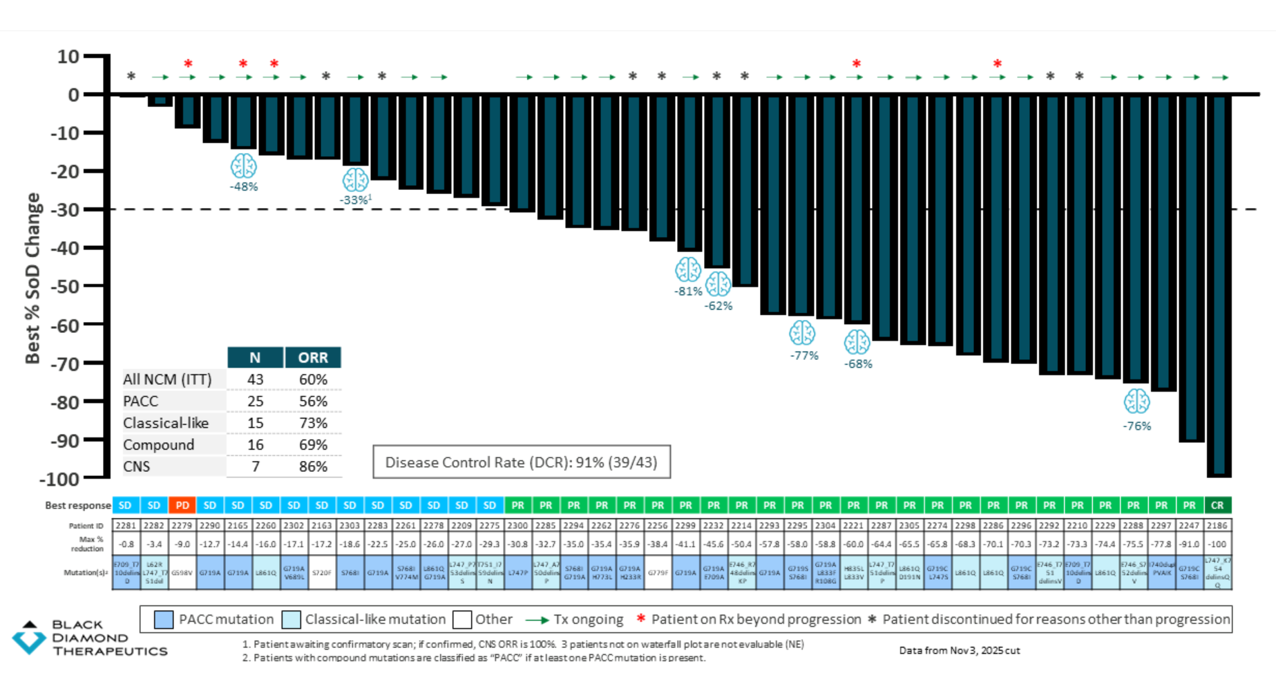 Wednesday brought the first data from this trial’s dose-expansion cohort in front-line patients with non-classical EGFR mutations. These typically lie outside the scope of drugs like AstraZeneca’s Tagrisso, and amount to a key resistance mechanism, and here Black Diamond cited a confirmed ORR of 60% among 43 front-line patients.