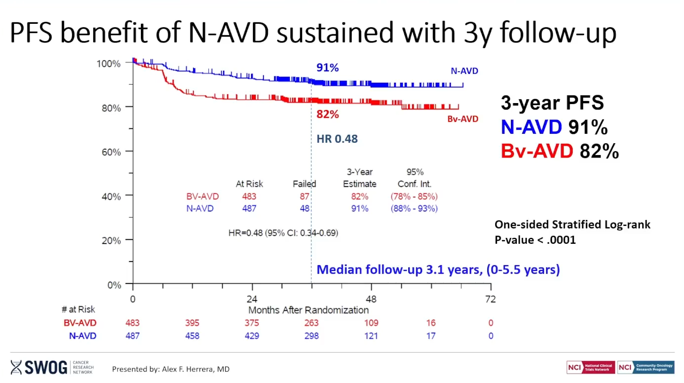 That presentation related to a three-year follow-up from SWOG S1826. With 487 efficacy-evaluable patients assigned to Opdivo plus chemo, and 483 to Adcetris/chemo, the PFS curves are continuing to show separation, amounting to a nine-point benefit favouring Opdivo at the three-year landmark, and a 52% reduction in risk of progression or death (p<0.0001).