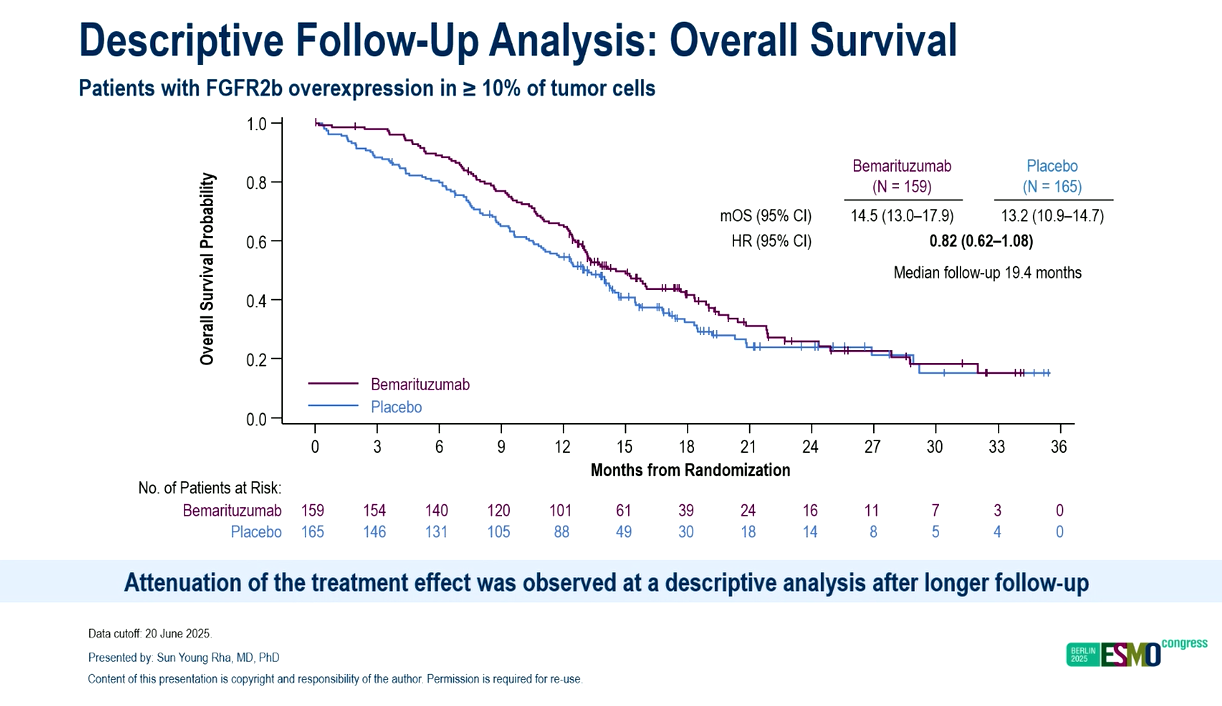 At the primary analysis, median overall survival reached 17.9 months with bemarituzumab plus chemotherapy, versus 12.5 months for chemotherapy alone, giving a hazard ratio of 0.61, and a p value of 0.005. Yet, the follow-up was less than a year, and with an additional 7.6 months, the survival curves converged. By the two-year mark, no meaningful difference remained.
