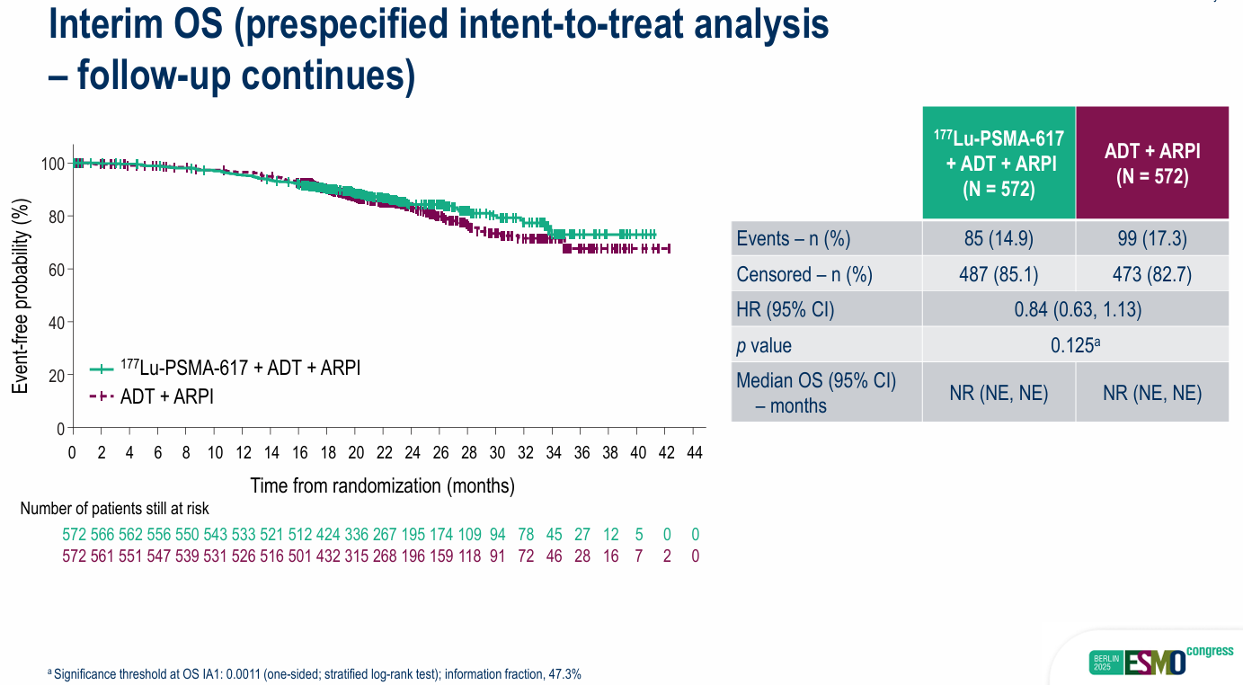 The primary endpoint of PSMAddition was rPFS (radiographic progression-free survival), with OS a secondary endpoint. The data presented at ESMO come from an interim analysis, with a cutoff date of 13 January 2025.