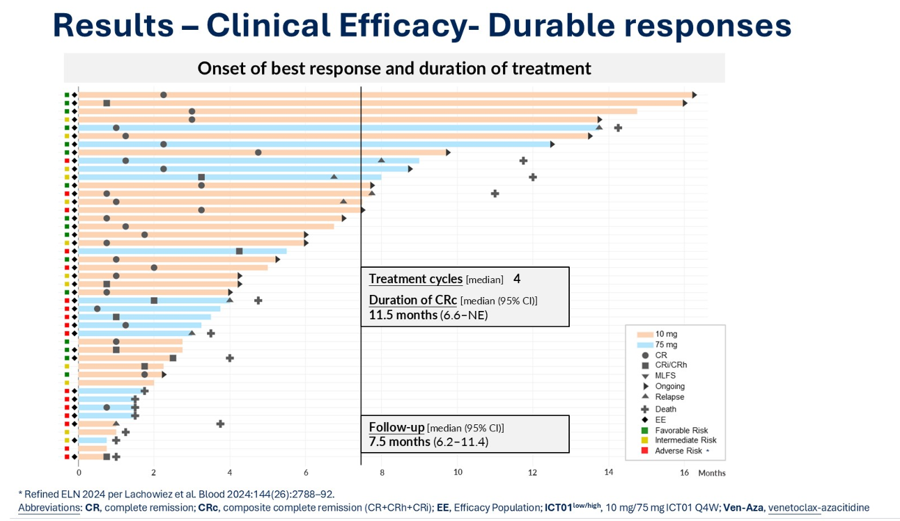 At the 10mg dose the combo achieved 96% CRc and 74% complete response rates in the intent-to-treat population, and in patients with TP53-mutated AML the numbers were 83% for CRc and 60% for CR. At a median follow up of 8.5 months, the nine-month overall survival rate reached 83%. Grade 3/4 febrile neutropenia was observed in 42% of patients, and neutropenia in 71%.