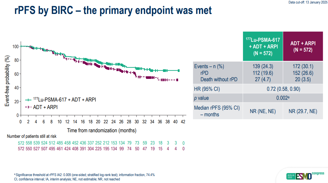 The primary endpoint of PSMAddition was rPFS (radiographic progression-free survival), with OS a secondary endpoint. The data presented at ESMO come from an interim analysis, with a cutoff date of 13 January 2025.