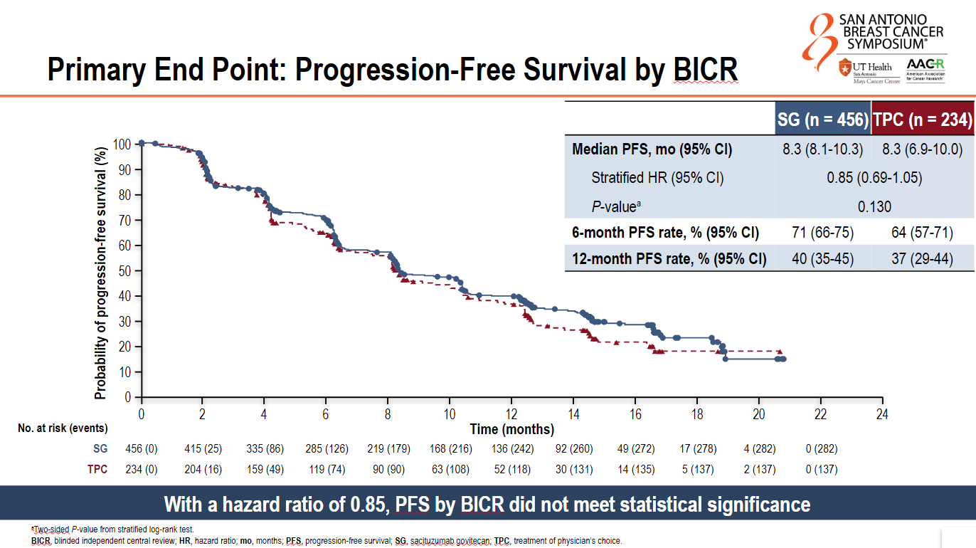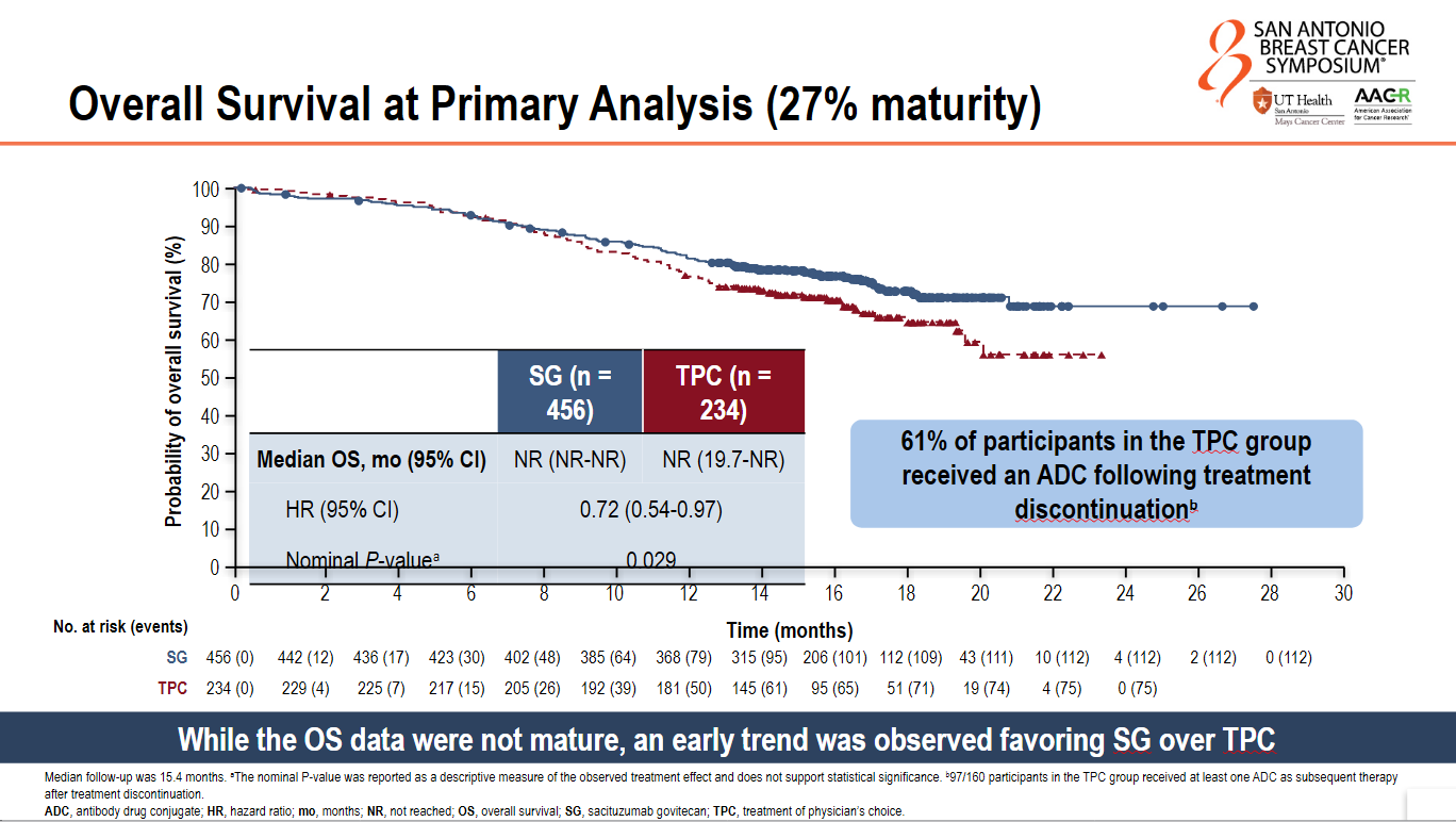 An early overall survival cut also showed an early trend favouring Trodelvy. At 27% data maturity, the OS hazard ratio was 0.72 and the nominal p value was 0.029. Jhaveri described this trend as "interesting", noting that it came despite the fact that 61% of patients in the control arm went onto receive an ADC following treatment discontinuation.