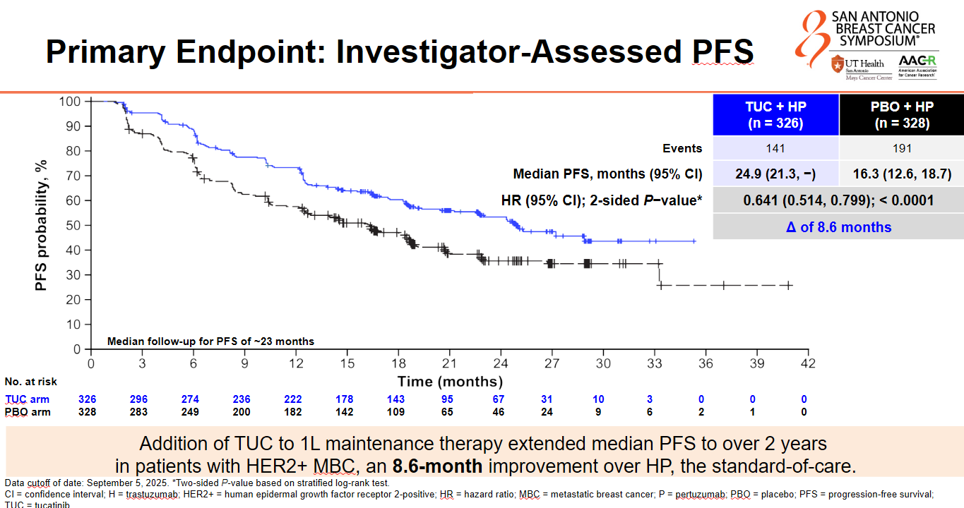 Pfizer’s small-molecule HER2 inhibitor Tukysa looks set to move into early HER2-positive breast cancer after showing a convincing benefit in first-line maintenance. The Her2climb-05 trial, presented at SABCS on Wednesday, found a 36% reduction in the risk of disease progression or death with Tukysa plus Roche’s Herceptin and Perjeta, versus Herceptin plus Perjeta, with a p value of less than 0.0001. Here, Tukysa could take on Pfizer’s CDK4/6 inhibitor Ibrance, which showed a similar relative benefit when added to standard of care in the Patina study; however, Patina only included patients with ER-positive disease, while Her2climb-05 enrolled ER-positive and negative patients. Still, the elephant in the room is AstraZeneca and Daiichi’s HER2-targeting ADC Enhertu, which recently impressed alongside Perjeta in Destiny-Breast09, in first-line HER2-positive disease. At a SABCS press conference, Dr Erika Hamilton of the Sarah Cannon Research Institute contended that “there will still be desire for a maintenance strategy, whether that’s Patina or Her2climb-05. I don’t think there’s going to be an appetite to continue Enhertu indefinitely.” An FDA decision on Enhertu in the front line is expected early next year; Pfizer has yet to disclose a filing for Tukysa, which is currently approved second line.